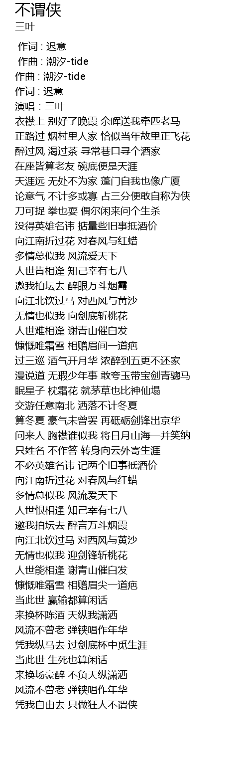 | [04:13.433] | píng wǒ zì yóu qù zhǐ zuò kuáng rén bù wèi xiá |
