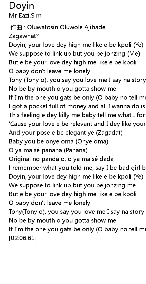 | [01:29.95] | Doyin, your love dey high me like e be kpoli Ye |