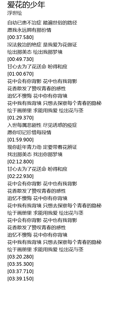| [00:39.100] | 没法救治的绝症 是我爱为花做证 |