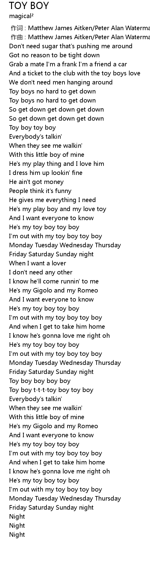 | [02:13.66] | Toy boy t-t-t-toy boy toy boy |