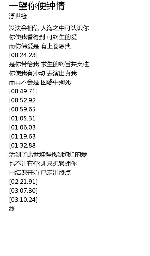 | [02:51.76][01:19.63] | 愿亲近你尽激情 那怕世界到了劫难仍伴你 |