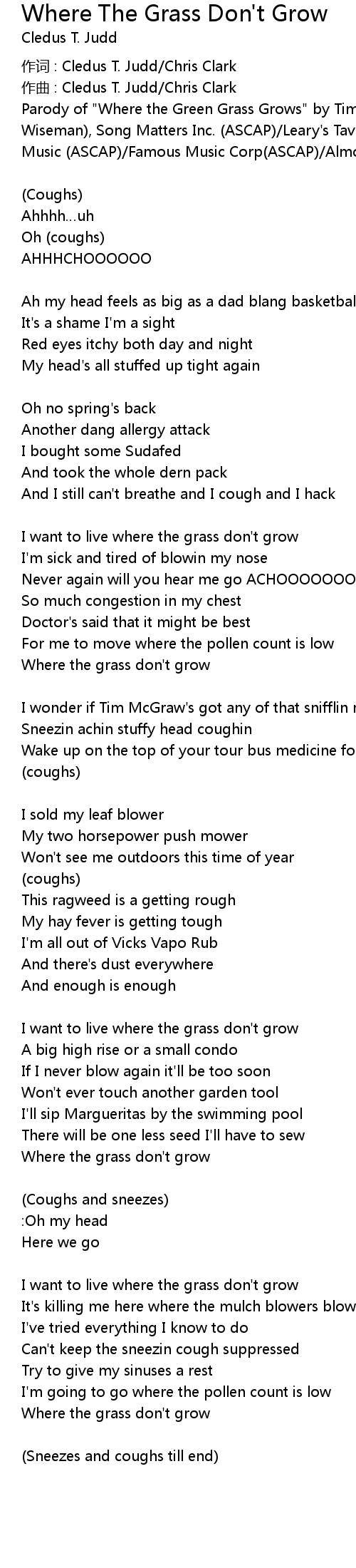 | Parody of " Where the Green Grass Grows" by Tim McGraw Jess Leary Craig Wiseman, Song Matters Inc. ASCAP Leary' s Tavern Music ASCAP Daddy Rabbit Music ASCAP Famous Music Corp ASCAP Almo Music Corp. ASCAP | |