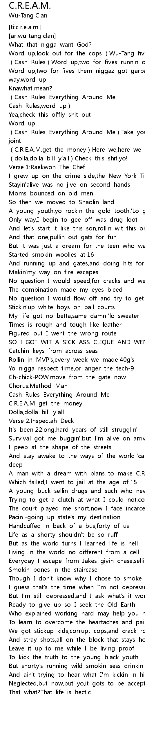 | [00:23.730] | C. R. E. A. M. get the money Here we, here we go |