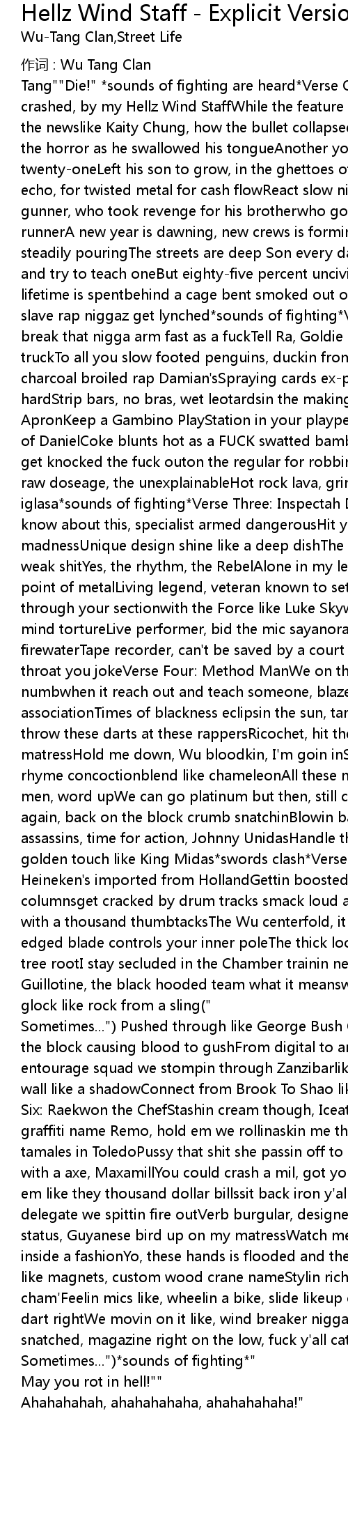 | Tang"" Die!" sounds of fighting are heard Verse One: Street LifeSo get your egg crashed, by my Hellz Wind StaffWhile the feature broadcast is splashed to tell the newslike Kaity Chung, how the bullet collapsed his lungHis father watched the horror as he swallowed his tongueAnother youth dead, before the age of twentyoneLeft his son to grow, in the ghettoes of the slumsWhere the shots echo, for twisted metal for cash flowReact slow nigga and get, P. L. O. By the lone gunner, who took revenge for his brotherwho got slain last summer by a cocaine runnerA new year is dawning, new crews is formingRival gangs is warring blood steadily pouringThe streets are deep Son every day is like a rerunSo I reach out and try to teach oneBut eightyfive percent uncivilized contentNo tolerance so a lifetime is spentbehind a cage bent smoked out on a park benchKiller instinct slave rap niggaz get lynched sounds of fighting Verse Two: Ghostface KillahSo yo break that nigga arm fast as a fuckTell Ra, Goldie left my beige jacket in his truckTo all you slow footed penguins, duckin from thesehot rocks that' s flamin, charcoal broiled rap Damian' sSpraying cards expionage, dodgeball sweat hardStrip bars, no bras, wet leotardsin the making, next album Blood On Chef' s ApronKeep a Gambino PlayStation in your playpenDiscovery Channel, catch the book of DanielCoke blunts hot as a FUCK swatted bamboohigh school dropouts, baseheads get knocked the fuck outon the regular for robbin a good nigga houseRough cut raw doseage, the unexplainableHot rock lava, gringo throw the flows iglasa sounds of fighting Verse Three: Inspectah DeckHa ha ha ha, yoWhat you know about this, specialist armed dangerousHit you close range with this madnessUnique design shine like a deep dishThe beat kick technique spit on your weak shitYes, the rhythm, the RebelAlone in my level heated up past the boiling point of metalLiving legend, veteran known to set trendLethal weapon, step through your sectionwith the Force like Luke SkywalkerRhyme author, orchestrate mind tortureLive performer, bid the mic sayanoraBorderline to insane, I rain firewaterTape recorder, can' t be saved by a court orderI got my sword cross your throat you jokeVerse Four: Method ManWe on the run with the golden guns, get you numbwhen it reach out and teach someone, blaze they bunsNow I' m guilty by associationTimes of blackness eclipsin the sun, target practicecommence when I throw these darts at these rappersRicochet, hit the charts, bloody your matressHold me down, Wu bloodkin, I' m goin inShootin bullets at the top ten, rhyme concoctionblend like chameleonAll these niggaz want cheese, is we mice or men, word upWe can go platinum but then, still can' t get no satisfactionOnce again, back on the block crumb snatchinBlowin backs inColdBlooded nine assassins, time for action, Johnny UnidasHandle that like arthritisStill, hold a golden touch like King Midas swords clash Verse Five: RZADrowning problems in Heineken' s imported from HollandGettin boosted off a killer bee pollen, stone columnsget cracked by drum tracks smack loud as gun clapsPin a crab to death with a thousand thumbtacksThe Wu centerfold, it be' s the Wind Ninja scrollSoul edged blade controls your inner poleThe thick loop, fruit from the forbidden tree rootI stay secluded in the Chamber trainin new recruitswith Fatal Guillotine, the black hooded team what it meanswhen bullets scream from the hot glock like rock from a sling" | |