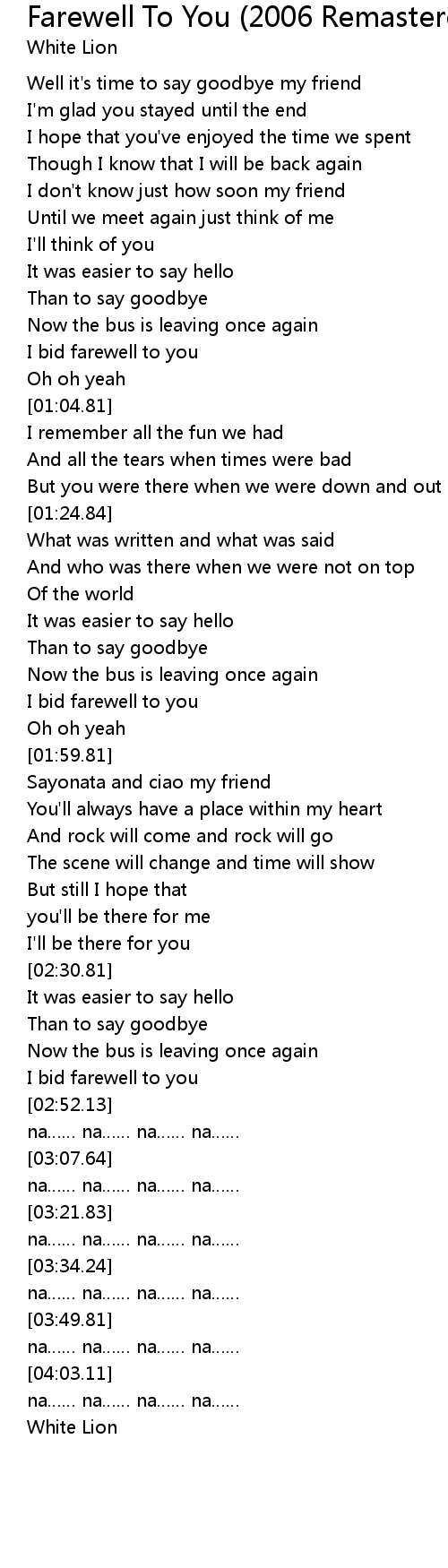| [00:17.33] | Well it's time to say goodbye my friend |