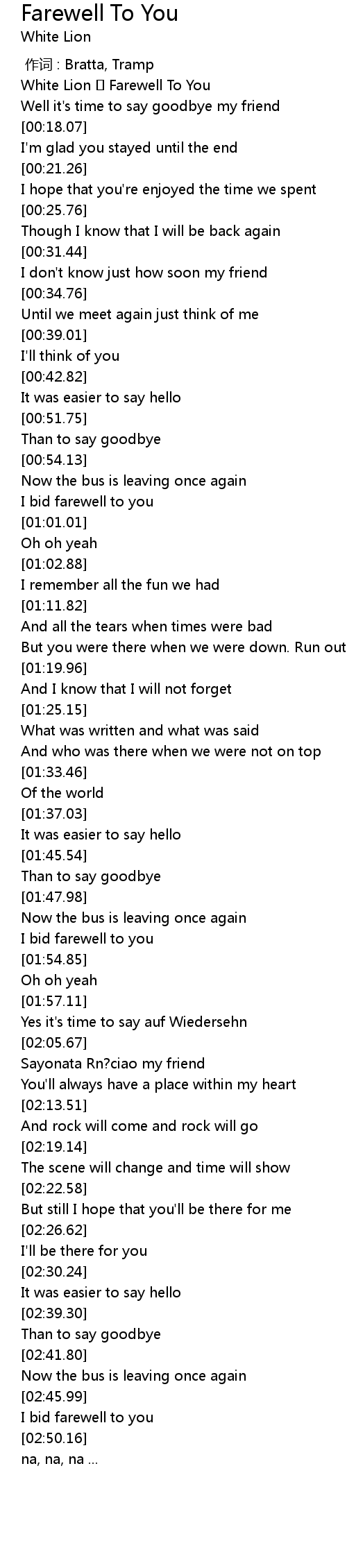 | [00:15.01] | Well it's time to say goodbye my friend |