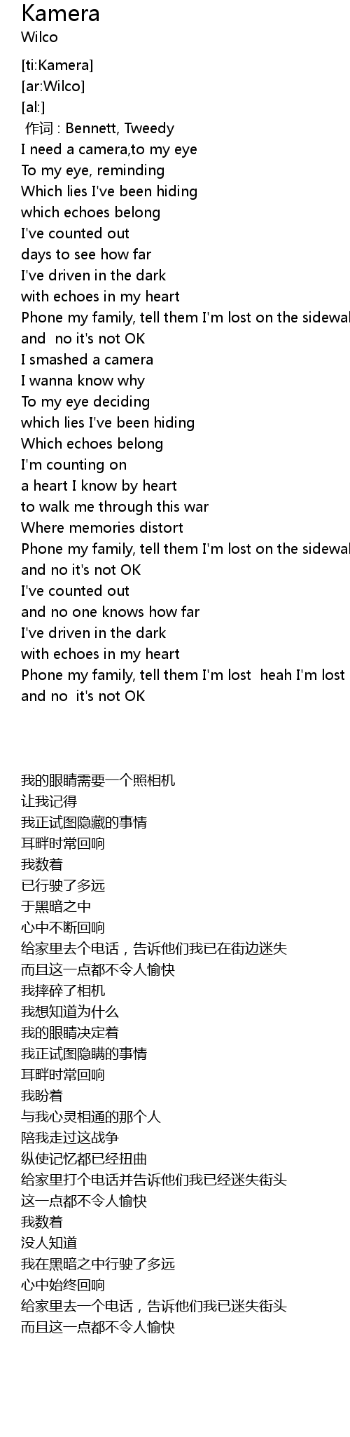| [00:00.00] | 作词 : Bennett, Tweedy |