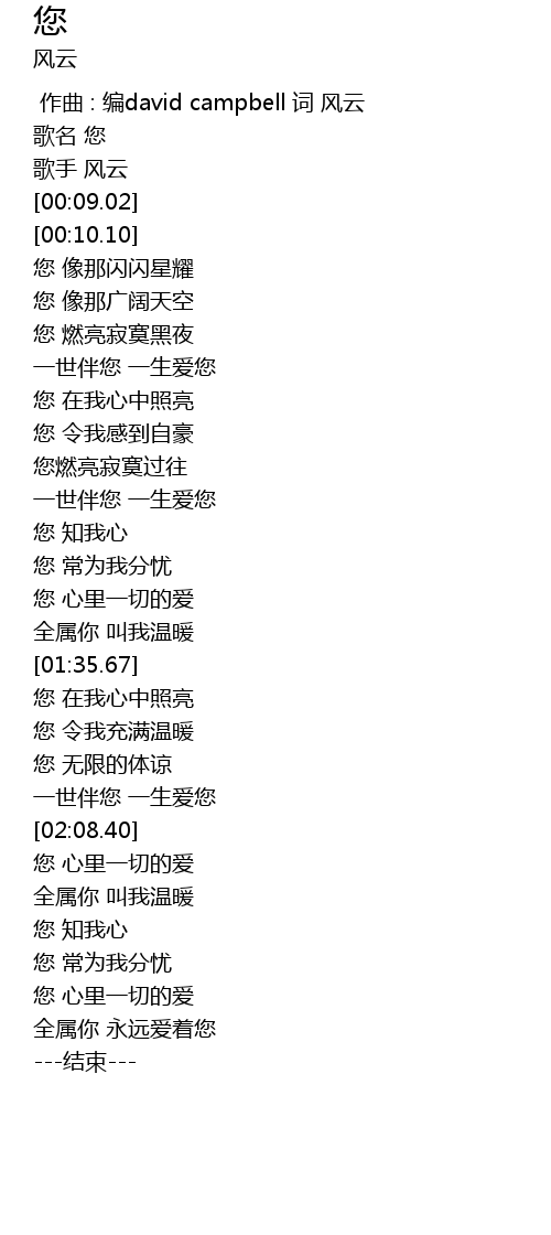 | [00:00.00] | 作曲 : 编david campbell 词 风云 |