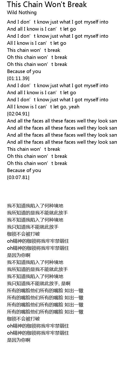 | [03:00.63] | Oh this chain won' t break |