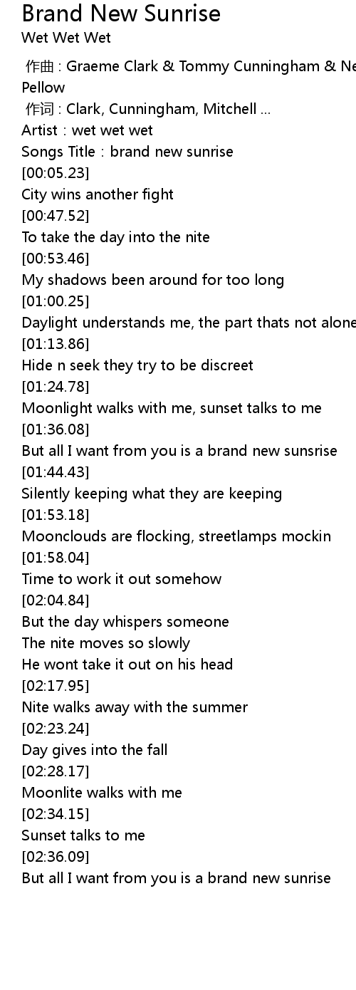 | [02:41.33] | But all I want from you is a brand new sunrise |