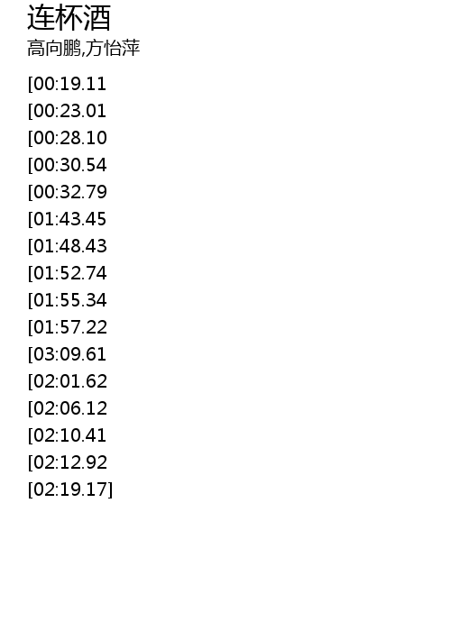 | [01:25.89][00:19.11] | 女:咱欢欢喜喜捧这杯连杯酒 |