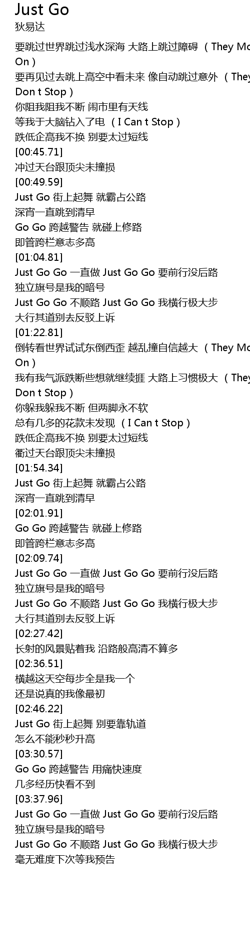 | [03:47.19] | Just Go Go 不顺路 Just Go Go 我横行极大步 |
