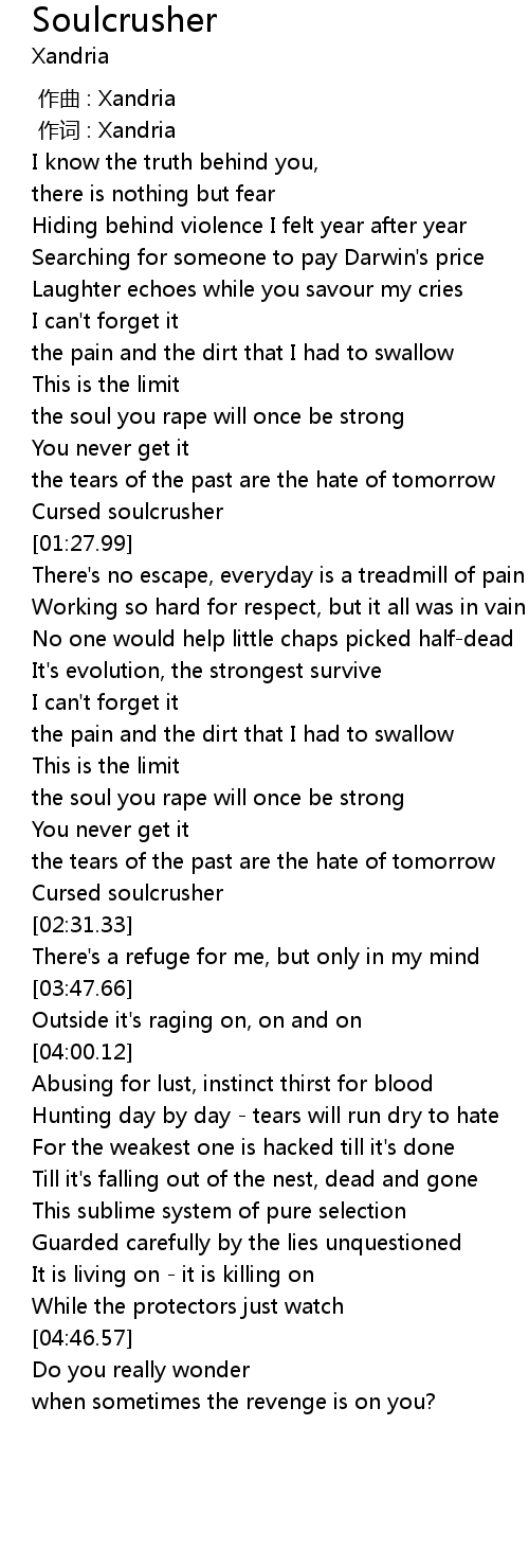 | [04:06.33] | Hunting day by day - tears will run dry to hate |