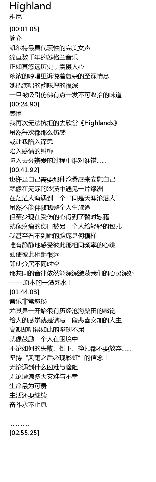 | [00:26.94] | 我再次无法抗拒的去欣赏《Highlands》 |