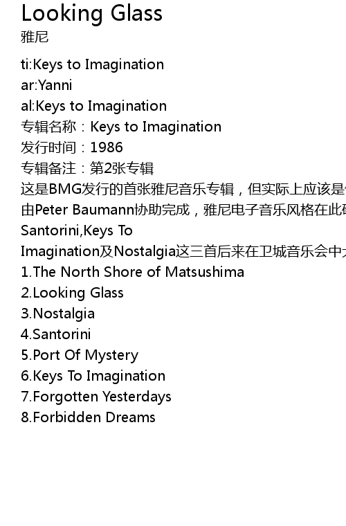 | [03:00.00] | Santorini,Keys To Imagination及Nostalgia这三首后来在卫城音乐会中大放光彩的作品最初均收录于此。 |