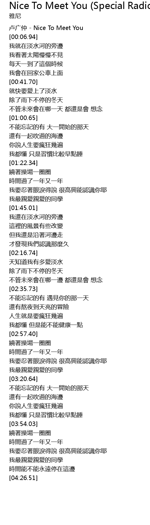 | [00:00.29] | 卢广仲 - Nice To Meet You |