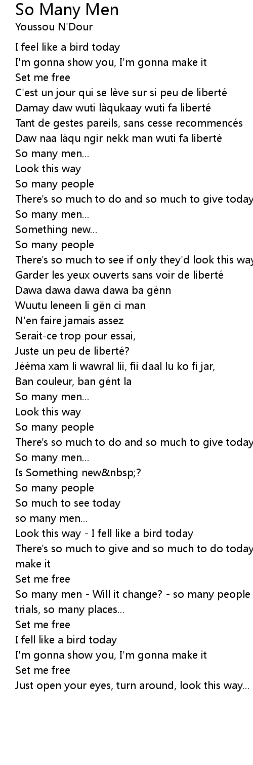 | So many men - Will it change? - so many people - Just open your eyes - so many trials, so many places... | |