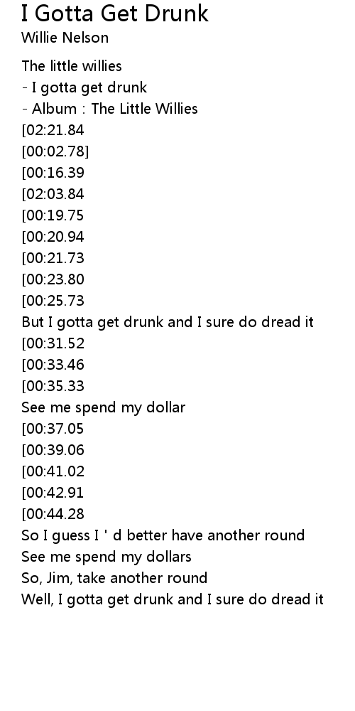 | [02:02.01][00:16.39] | Gotta get drunk and I sure do dread it |