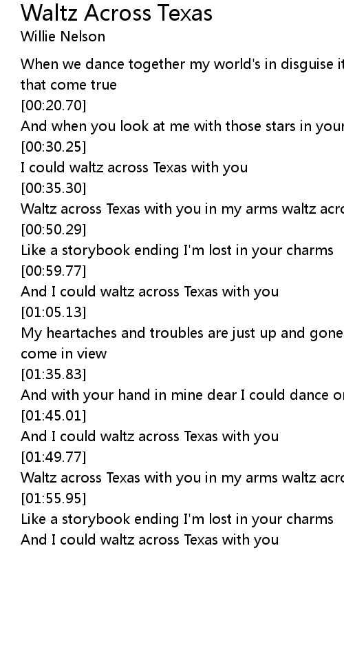 Waltz across Texas with you in my arms waltz across Texas with you |