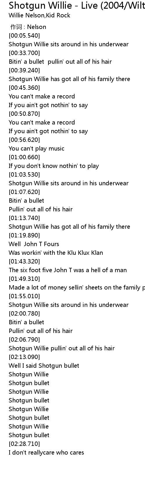 | [02:09.600] | Shotgun Willie pullin' out all of his hair |