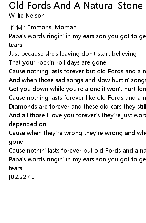 | [01:02.90] | Cause nothing lasts forever like old Fords and a natural stone |