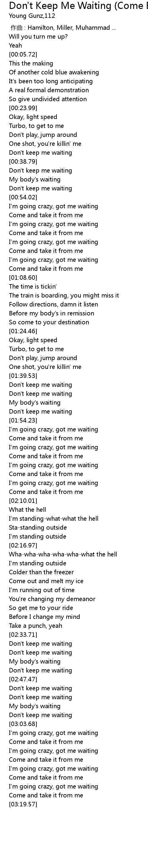 | Song | Don't Keep Me Waiting (Come Back Soon) - Album Version (Explicit) |