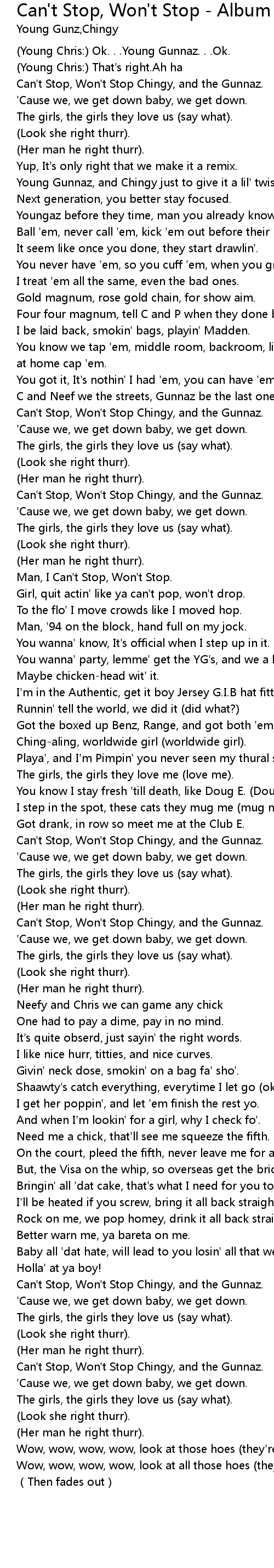 | [00:13.09] | Can' t Stop, Won' t Stop Chingy, and the Gunnaz. |