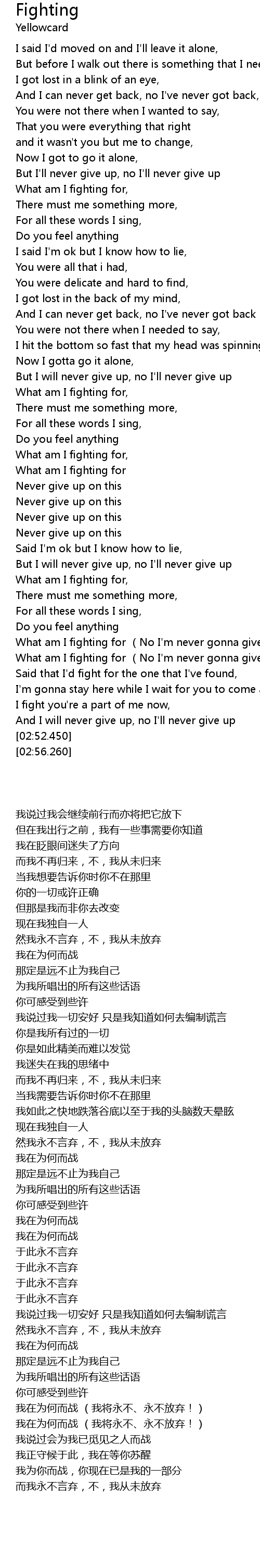 | [02:36.940] | What am I fighting for (No I'm never gonna give up, give up) |