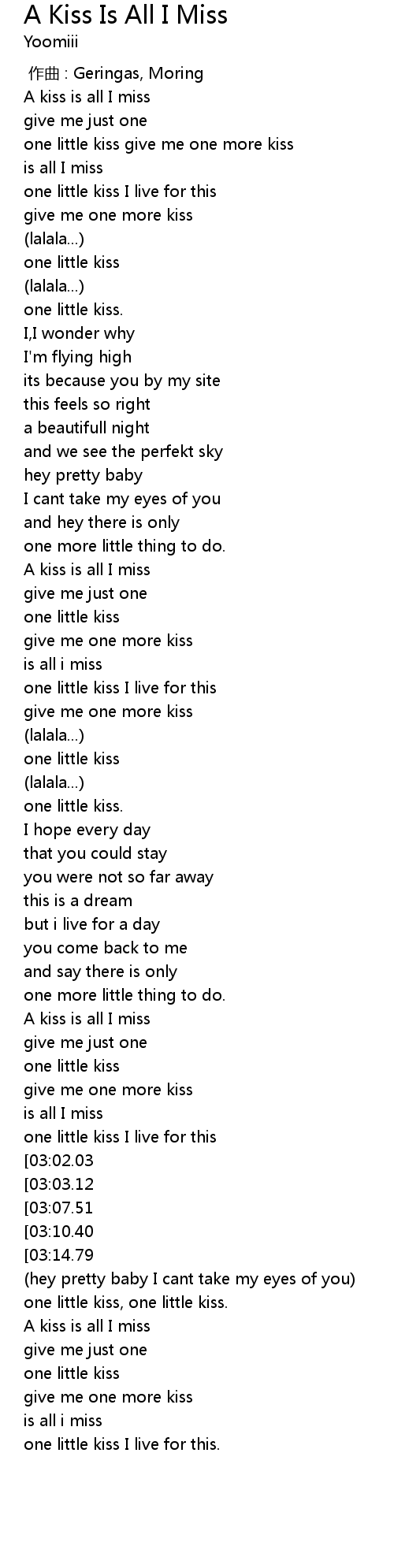 | [02:03.59] | A kiss is all I miss |