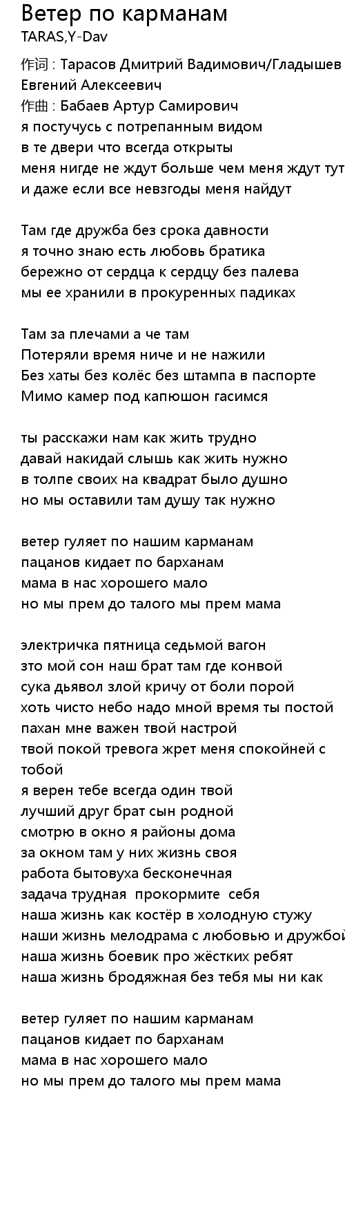 作词 : Тарасов Дмитрий Вадимович/Гладышев Евгений Алексеевич |