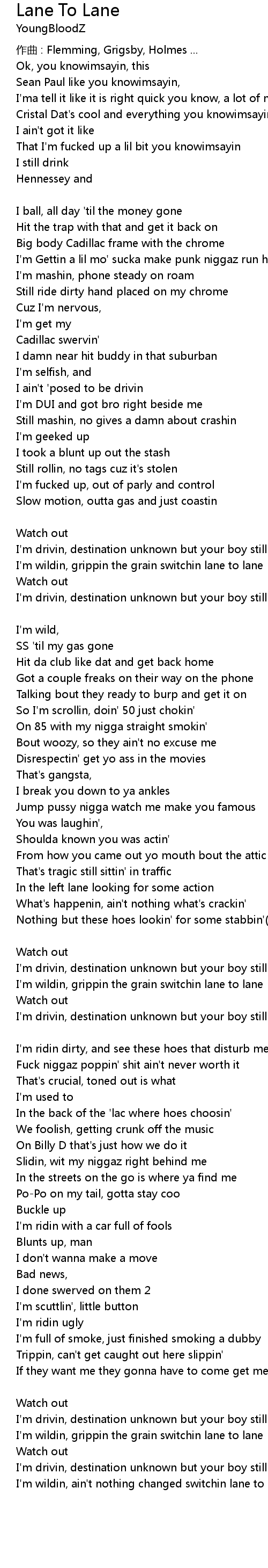 | Nothing but these hoes lookin' for some stabbin' Switchin Lane To Lane Chorus | |