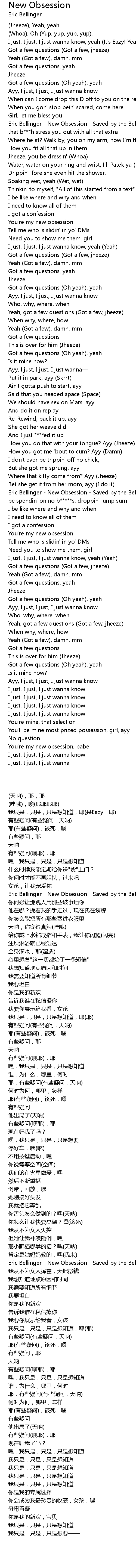 | [01:54.74] | Eric Bellinger New Obsession Saved by the Bellinger I don' t ever be spendin' on no b s, droppin' lump sum |