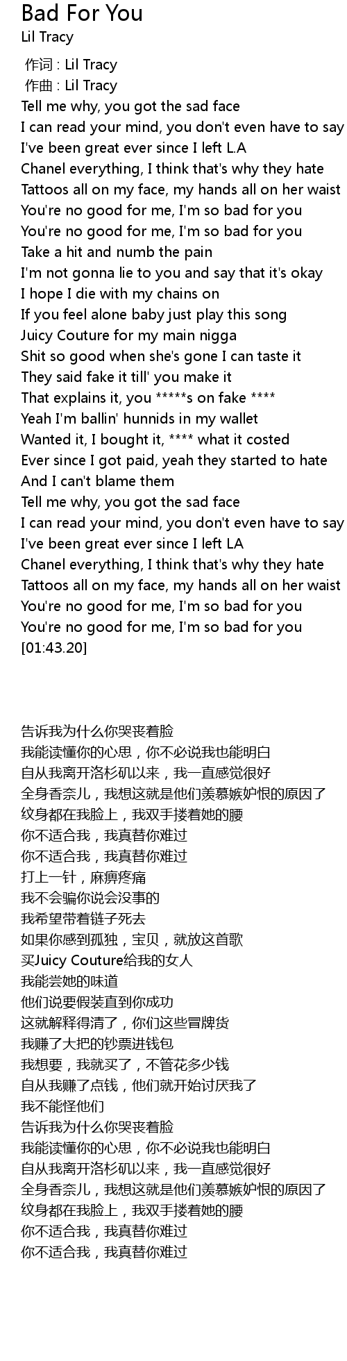 | [01:36.42] | You're no good for me, I'm so bad for you |