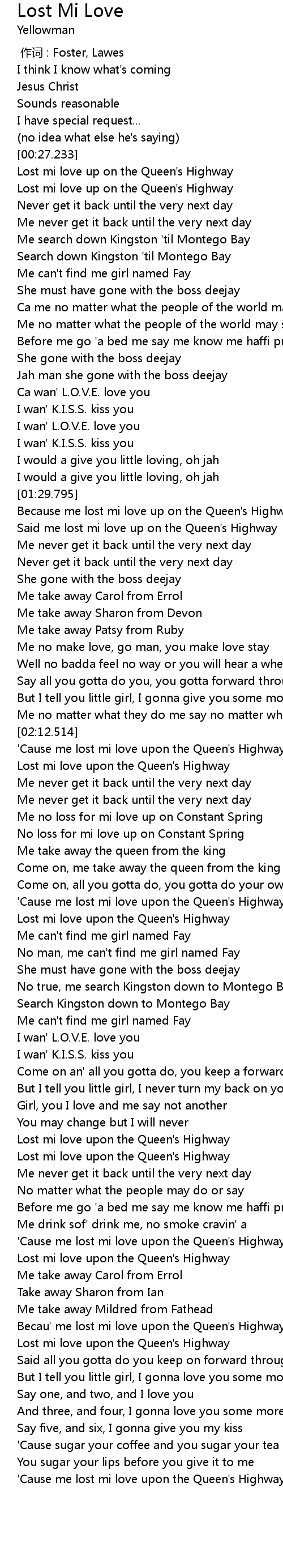 | [01:33.482] | Said me lost mi love up on the Queen's Highway |