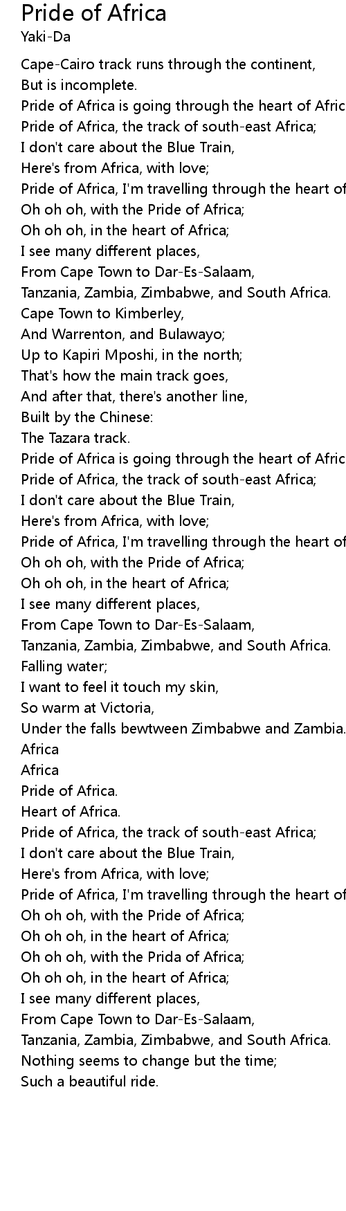 | Pride of Africa, I'm travelling through the heart of Africa. | |