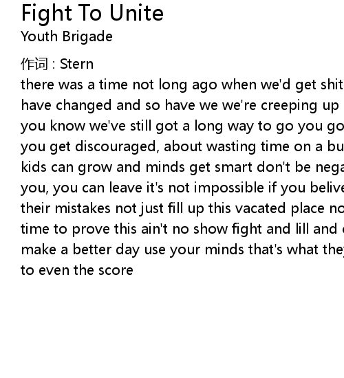| there was a time not long ago when we' d get shit, everywhere we' d go but times have changed and so have we we' re creeping up on society stop complaining don' t you know we' ve still got a long way to go you gotta fight, fight, fight to unite you get discouraged, about wasting time on a bunch of kids with simple minds but kids can grow and minds get smart don' t be negative it' s a start no one' s forced you, you can leave it' s not impossible if you belive we' ve got to learn from their mistakes not just fill up this vacated place now' s the time long ago it' s time to prove this ain' t no show fight and lill and claw our way think we' ll make a better day use your minds that' s what they' re for don' t waste time trying to even the score |