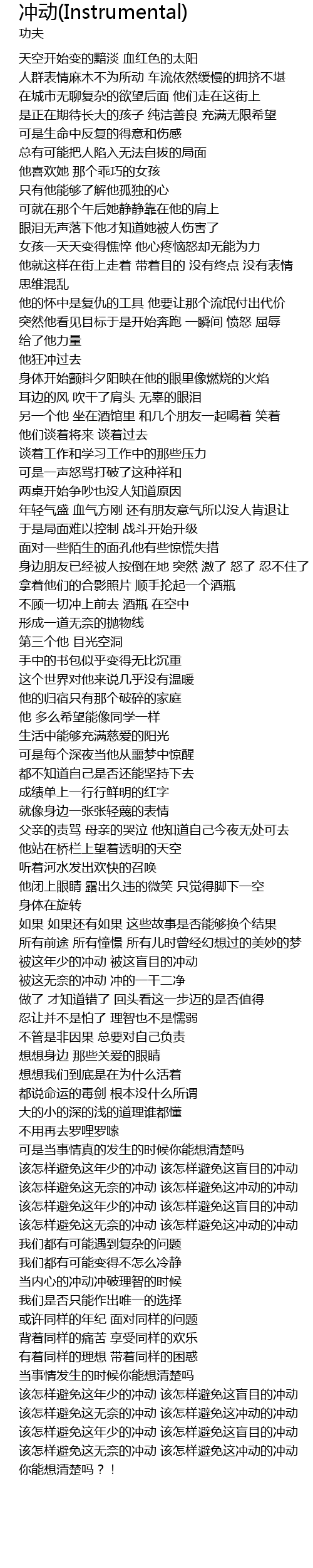 | [05:19.48] | gāi zěn yàng bì miǎn zhè wú nài de chōng dòng gāi zěn yàng bì miǎn zhè chōng dòng de chōng dòng |
