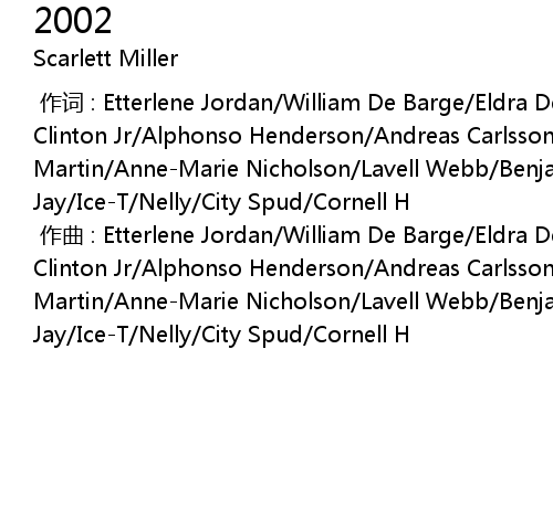 | [00:00.00-1] | 作词 : Etterlene Jordan/William De Barge/Eldra De Barge/George Clinton Jr/Alphonso Henderson/Andreas Carlsson/Jacob Schulze/Tracy Marrow/Max Martin/Anne-Marie Nicholson/Lavell Webb/Benjamin Levin/Ed Sheeran/E. Jay/Ice-T/Nelly/City Spud/Cornell H |