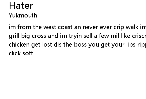 | im from the west coast an never ever crip walk im like the birdman platinum grill big cross and im tryin sell a few mil like criscross im ultra cocky tell a chicken get lost dis the boss you get your lips ripped i let clips off your hole click soft |