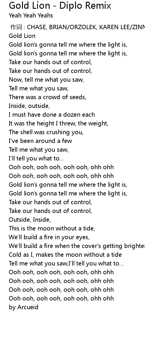 | [00:11.00] | Gold lion' s gonna tell me where the light is, |