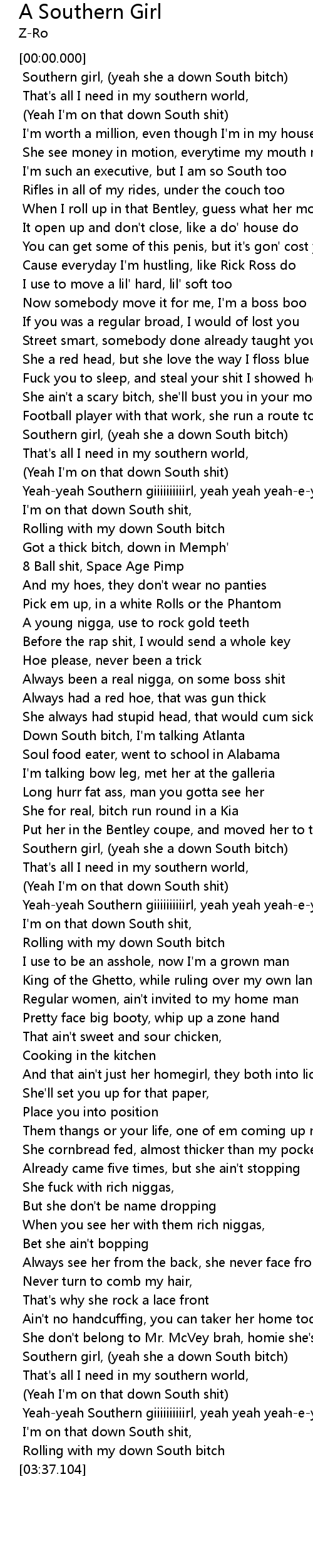 | [00:56.369] | Southern girl, (yeah she a down South bitch) |