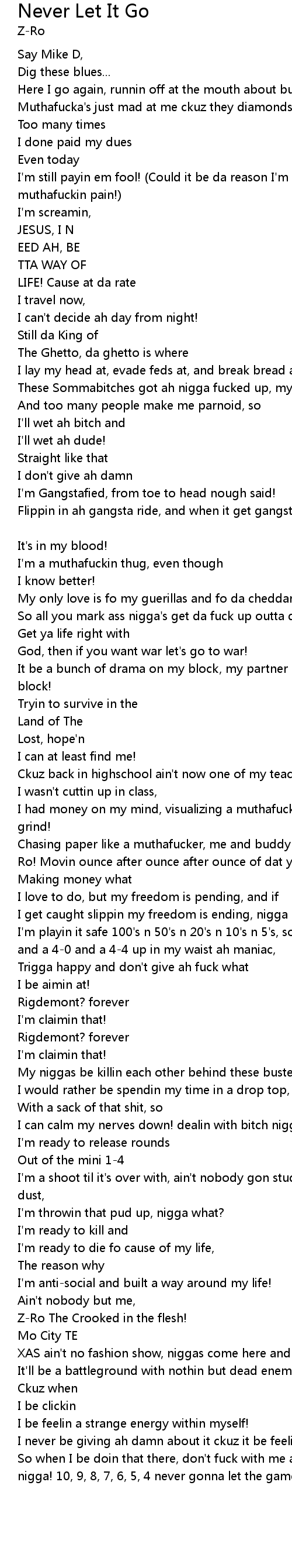 | So when I be doin that there, don't fuck with me and take me outta my vibe, nigga! 10, 9, 8, 7, 6, 5, 4 never gonna let the game go... fasho! |