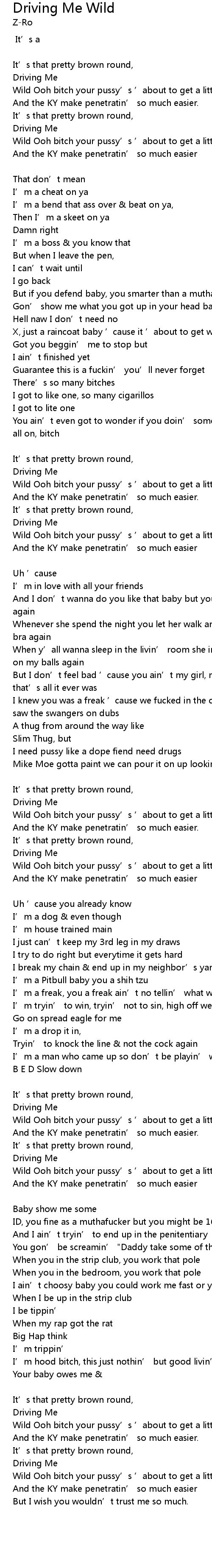 | Mike Moe gotta paint we can pour it on up lookin’ for a few bitches that’ll skeet on her. [Hook: Z-Ro] | |
