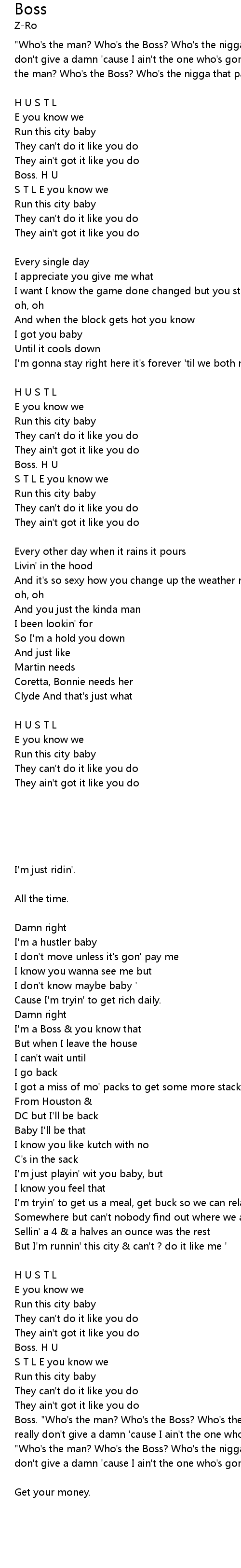 | " Who' s the man? Who' s the Boss? Who' s the nigga that paid the cost? I really don' t give a damn ' cause I ain' t the one who' s gonna take the loss..." " Who' s the man? Who' s the Boss? Who' s the nigga that paid the cost? I really don' t give a damn ' cause I ain' t the one who' s gonna take the loss..." Chorus: M a | |