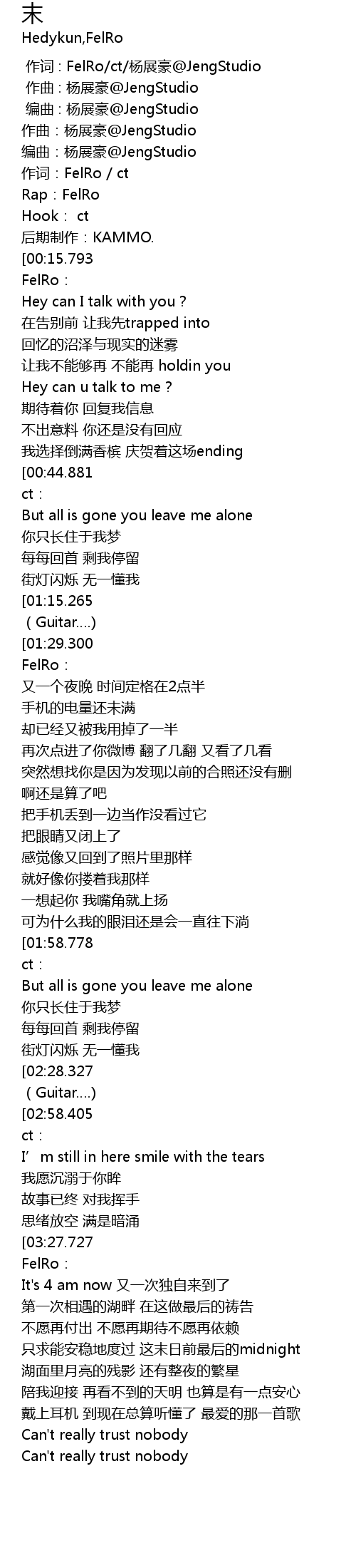 | [00:00.000] | 作词 : FelRo/ct/杨展豪@JengStudio |