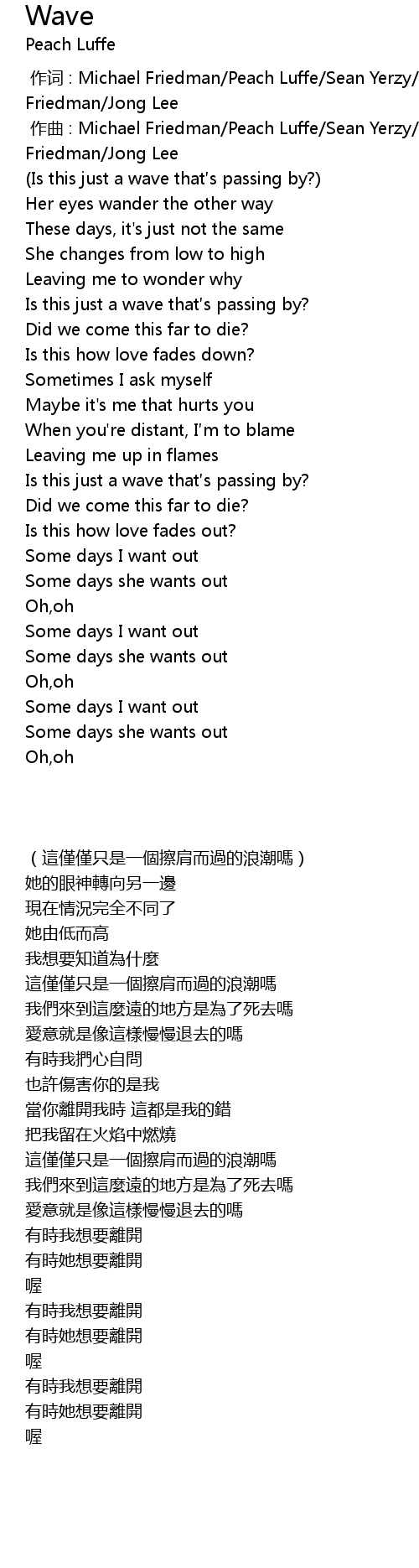 | [00:00.000] | zuo qu : Michael Friedman Peach Luffe Sean Yerzy Jonathan Friedman Jong Lee |