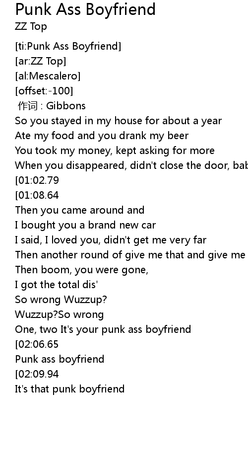 | [00:35.56][01:08.64][02:05.34][02:15.90] | It' s your punk ass boyfriend |