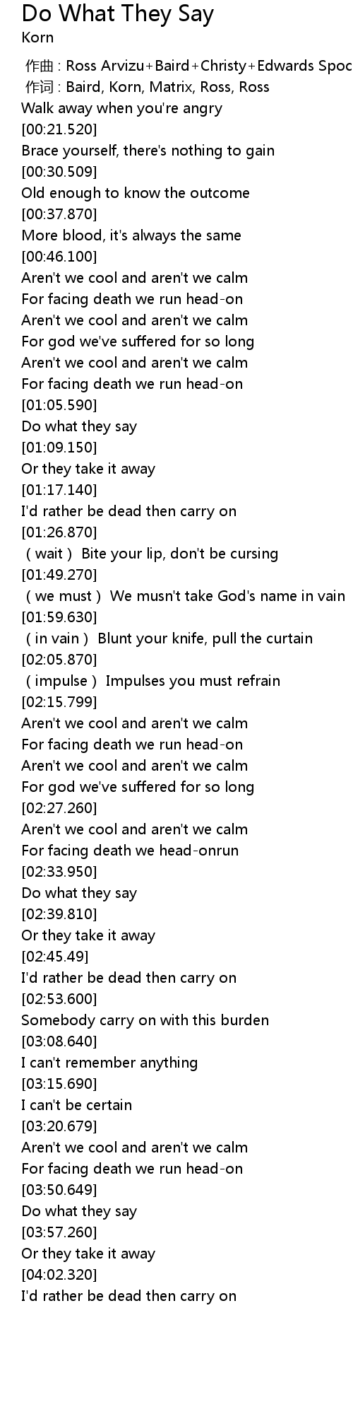 | [00:01.00] | 作词 : Baird, Korn, Matrix, Ross, Ross |