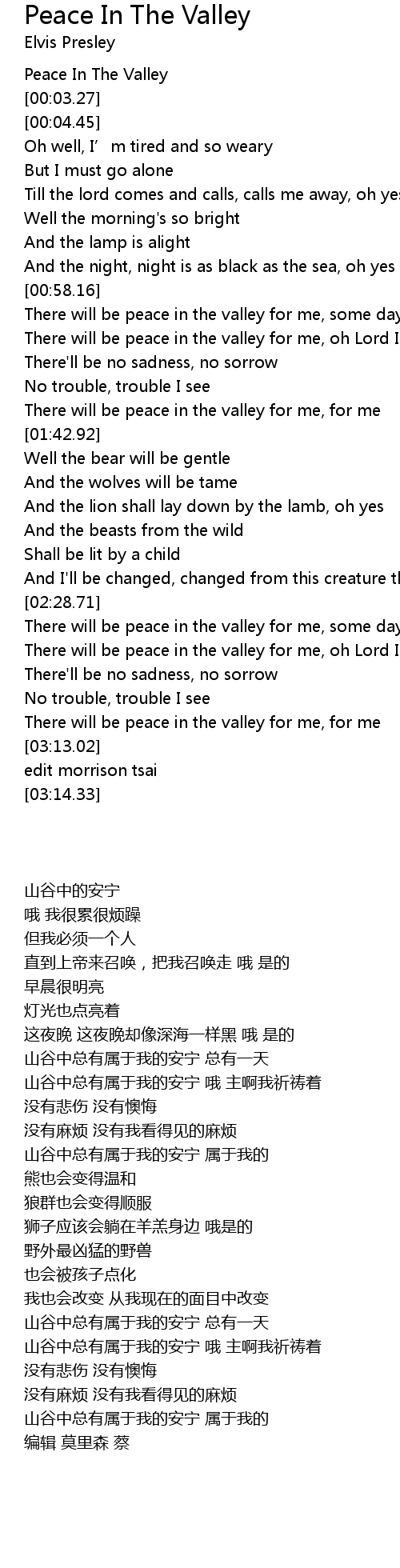 | [02:42.55] | There will be peace in the valley for me, oh Lord I pray |