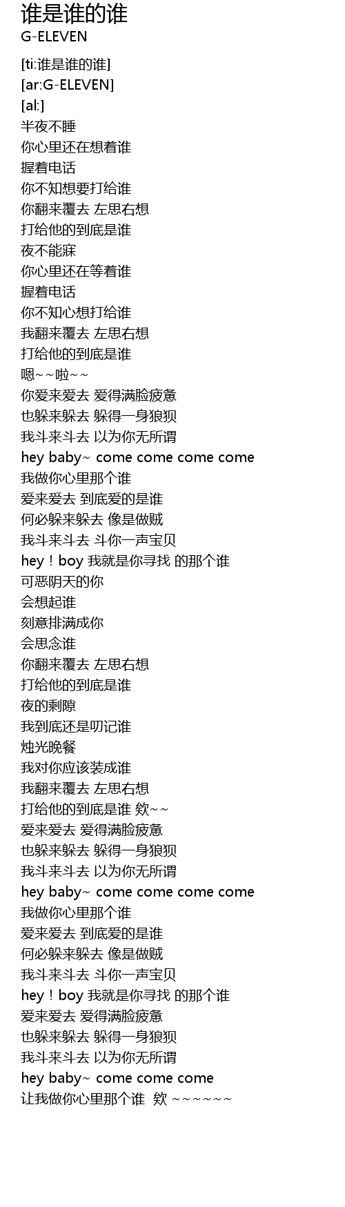 | [01:44.07] | hey! boy wǒ jiù shì nǐ xún zhǎo de nà gè shuí |